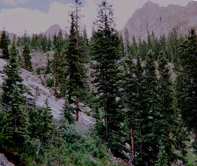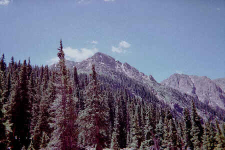 Jupiter was the day’s objective. Being a Centennial, it does not get near the attention that Windom, Sunlight or Eolus receive. The approach follows the Columbine Pass trail up to a drainage southwest of Jupiter. This was the first time up this side of the basin. After five treks up the Twin Lakes trail, this was a pleasant change of perspective. The stands of Douglas Firs on the south side of the basin are much larger. It is probably a result of greater snow pack and moisture on north-facing slopes. Assuming that the source of water, in the form of rain and snow are roughly equal across the basin, the vegetation provides a dramatic demonstration of retaining snow pack and the lack of the melting and evaporation on the sunny side of the valley.