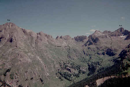 Ascending the headwall up to the Twin Lakes, the trail passed by several waterfalls. At the Twin Lakes, the trail traversed left to Eolus and right to Windom and sunlight. In 1993, this upper valley was mostly snow, this year it was almost completely dry. Just below the slanting shelf, Norm and Kris decided to go at their own pace. We all seemed to be feeling the effects of the altitude. Stu and I continued. The weather was now looking questionable, so Stu went for the summit. I climbed North Eolus, and we waved from peak to peak at 10AM, as we topped out.
