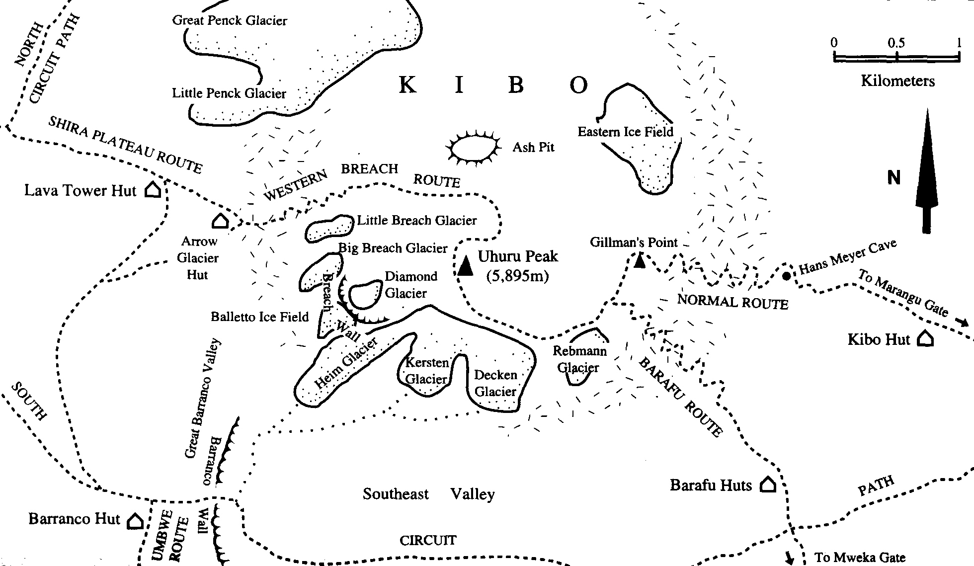 Decken, Kersten, and Helm Glaciers) on Kibo, and a trail leading north