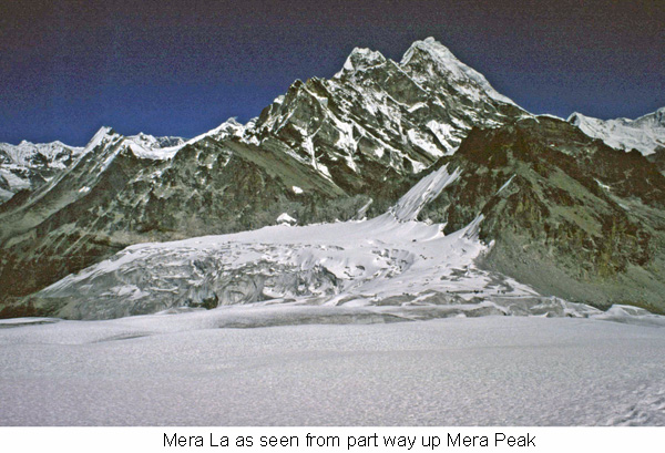 The next three days took us to Dig Karka, Kare, and finally to base camp at Mera La (17,800'). This was snow camp on a glacial shelf that had great views west to the Charpati Himal. From Mera La we could see the Mera Glacier ramping up the 3600' to the summit. The glacier walk up to high camp (19000') made for a short day and allowed us to enjoy the views and the warmth of the rocky campsite. While the valley was covered in the daily cold gray fog, we sat in full sunlight on a patch of rock in a sea of glacier.