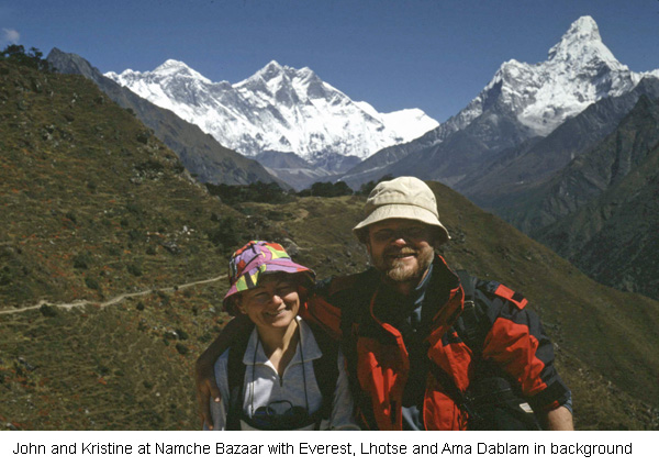 Nepal, sandwiched between India and China, is only half as large as Colorado by area, but being situated along the highest points of the Himalayan range, is twice as tall. The country is a Mecca for mountain scenery, trekking and climbing. Of the countless possibilities, the Nepal Mountaineering Association has designated 104 expedition peaks and 18 trekkers peaks. Mera Peak (6476m/21,247') is the highest of the eighteen trekkers peaks and has been a trek we've been considering for several years. Located in the Khumbu Himal, the peak offers spectacular mountain scenery, including views of five 8000m peaks! This October, Deac Lancaster, Norm Henderson, Kris and I (CMCers) joined up with Warren Storkman, Steve Eckert, Andy Skumanich and Elaine Holland (from the Bay Area Peak Climbing section of the Sierra Club) to trek up the Hinku Valley and climb Mera.